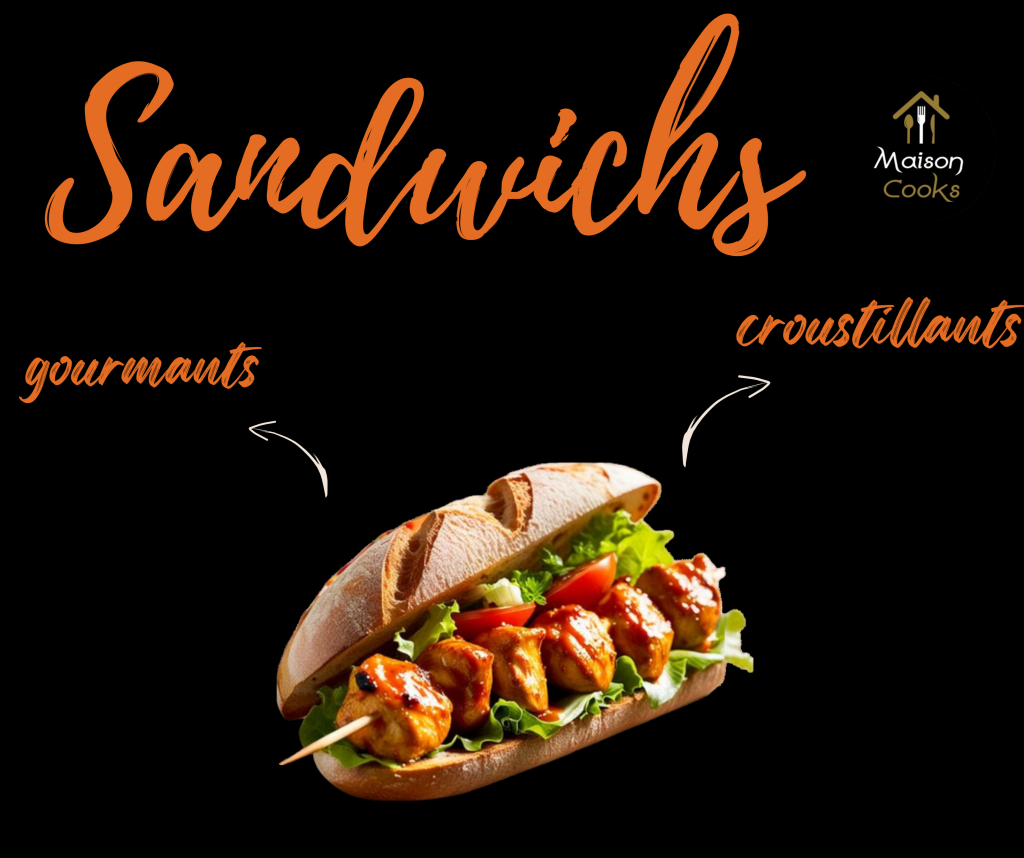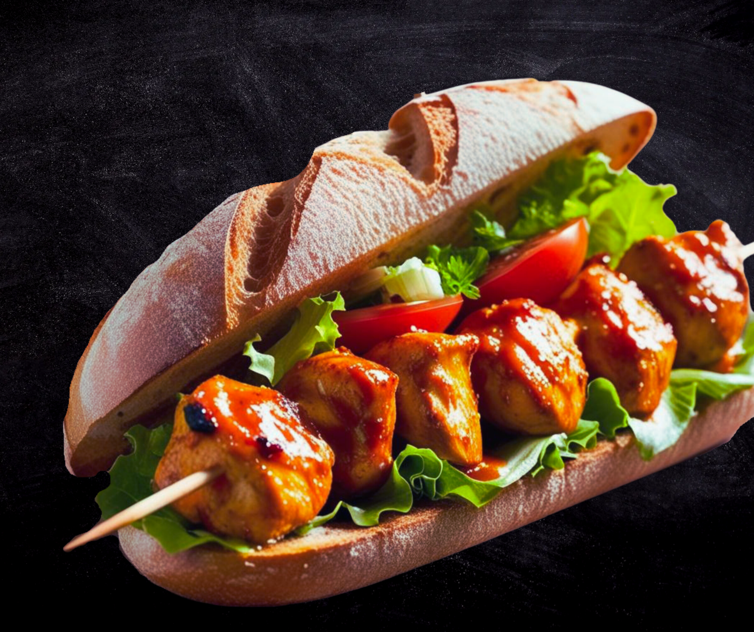 Du goût, du croquant, pour un plaisir intense! 8€50 (salade – tomate – oignon – sauce au choix) – Brochette de Poulet – Merguez – Émietté de poulet Formule Sandwich + Frites Fraîches + Boisson 33cl – 12€